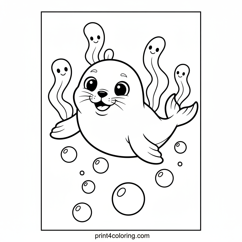 Dive into an enchanting underwater world with our curious seal explorer! Watch as this happy seal gracefully glides through a magical garden, where friendly seaweed smiles and round bubbles dance upwards. A wonderful scene for young artists to bring to life with their favorite colors, imagining a joyful sea adventure.
