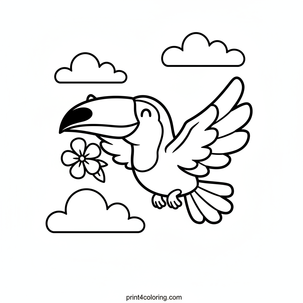 Join this happy toucan as it soars through the sky with a big smile! Its wings are spread wide, carrying a beautiful tropical flower in its colorful beak. Simple, puffy clouds drift by, making a perfect backdrop for this cheerful bird's flight. Get ready to add vibrant colors to this delightful scene!