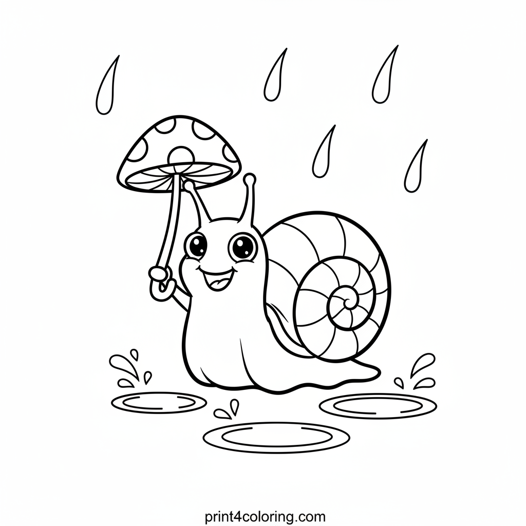 Join our cheerful snail on a delightful rainy day adventure! This cute little friend is using a vibrant, polka-dotted mushroom cap as a perfect umbrella, keeping dry as it happily navigates gentle puddles. Imagine the bright colors for the snail's shell, mushroom, and raindrops. A joyful scene for young artists!