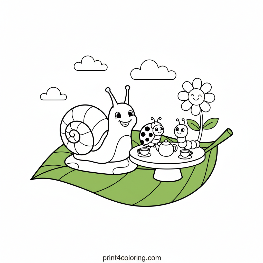 Join a sweet snail for a charming tea party right in the garden! Sitting at a tiny stone table, the snail shares a delightful moment with a friendly ladybug and a smiling caterpillar. This happy scene, set on a big green leaf, is perfect for little artists to bring to life with their favorite colors.