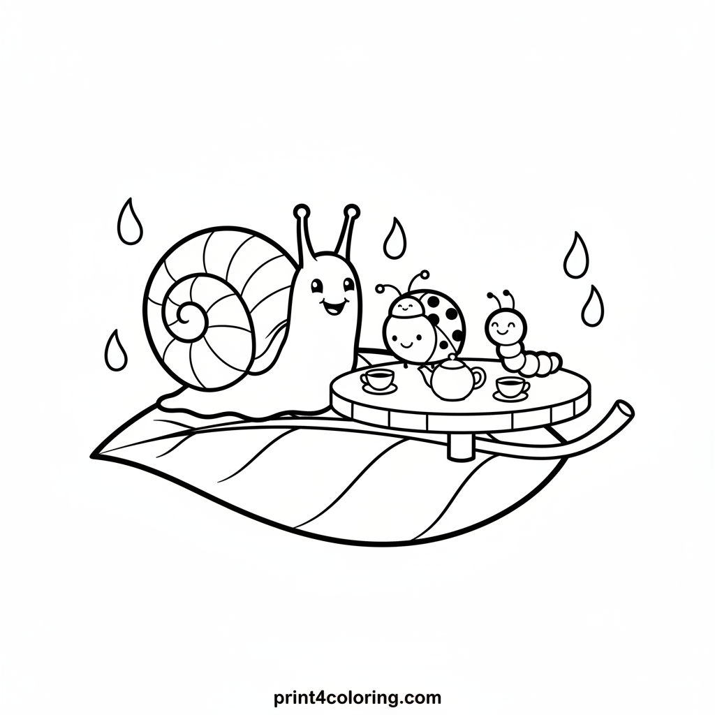 Join a sweet snail as it hosts a delightful garden tea party! A friendly ladybug and a smiling caterpillar are special guests, gathered around a tiny stone table on a big green leaf. Imagine the happy chatter and pretend treats as these garden friends share a charming afternoon. Ready to color!