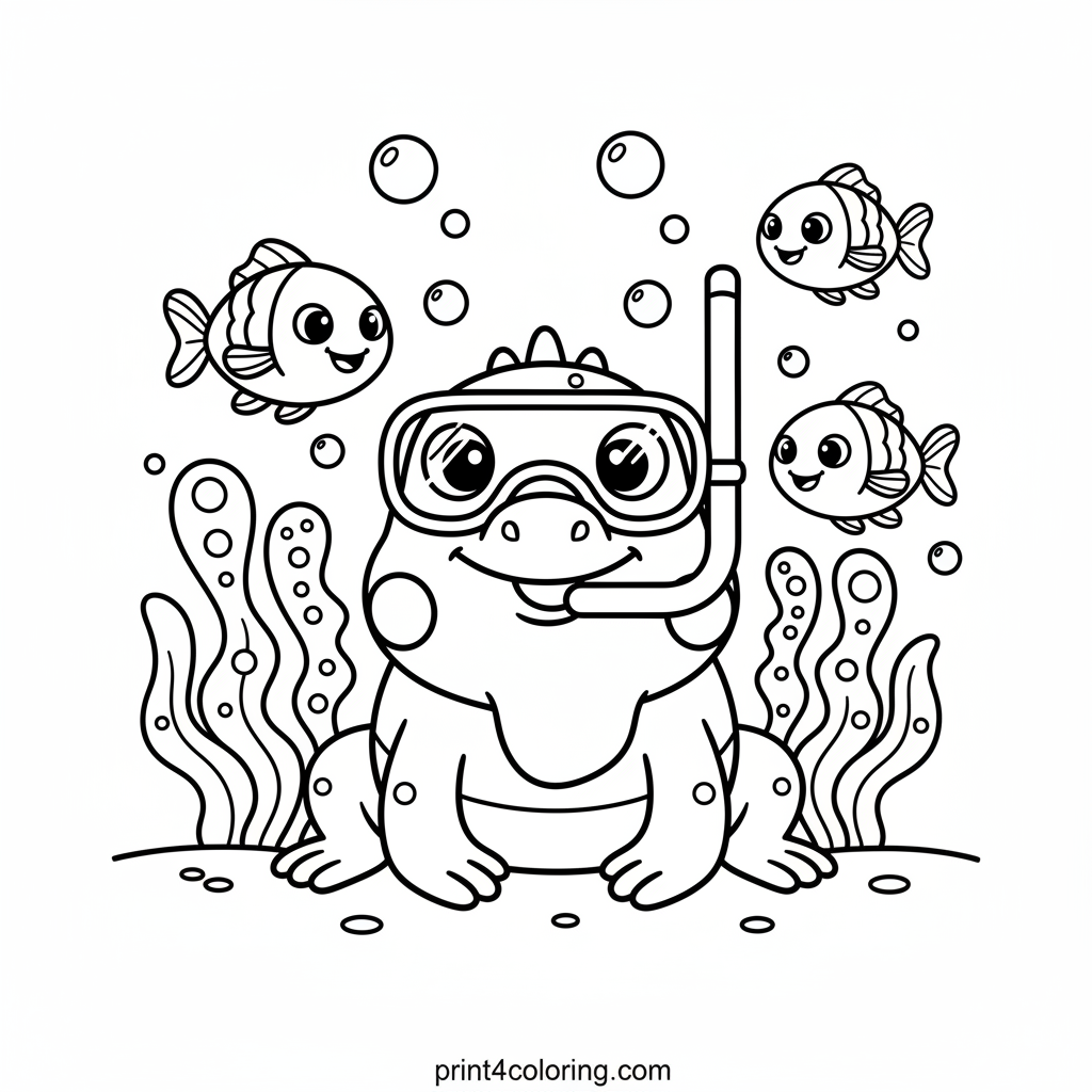 Dive into a vibrant underwater world with our friendly iguana! Sporting a tiny snorkel and goggles, this curious explorer swims gracefully alongside happy fish and through bubbly green seaweed. Imagine the bright colors you'll use to bring this clear ocean scene to life, discovering the wonders beneath the waves with your new reptilian pal.