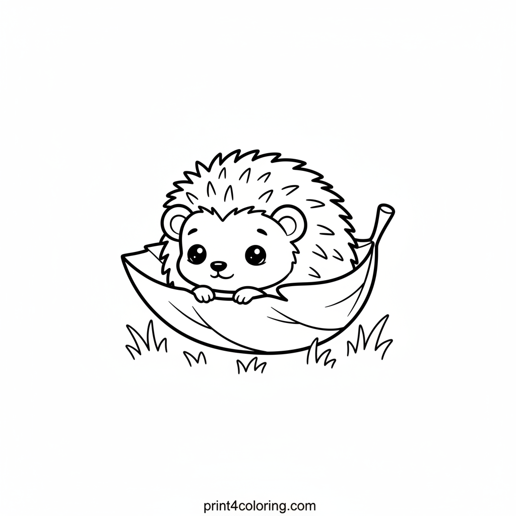 Discover a tiny, adorable baby hedgehog enjoying a peaceful nap. Curled up tightly with big, sleepy eyes, it's nestled inside a warm, soft autumn leaf, resting gently on a bed of simple green grass. This sweet scene invites you to add bright, cozy colors to bring this little sleeper to life.