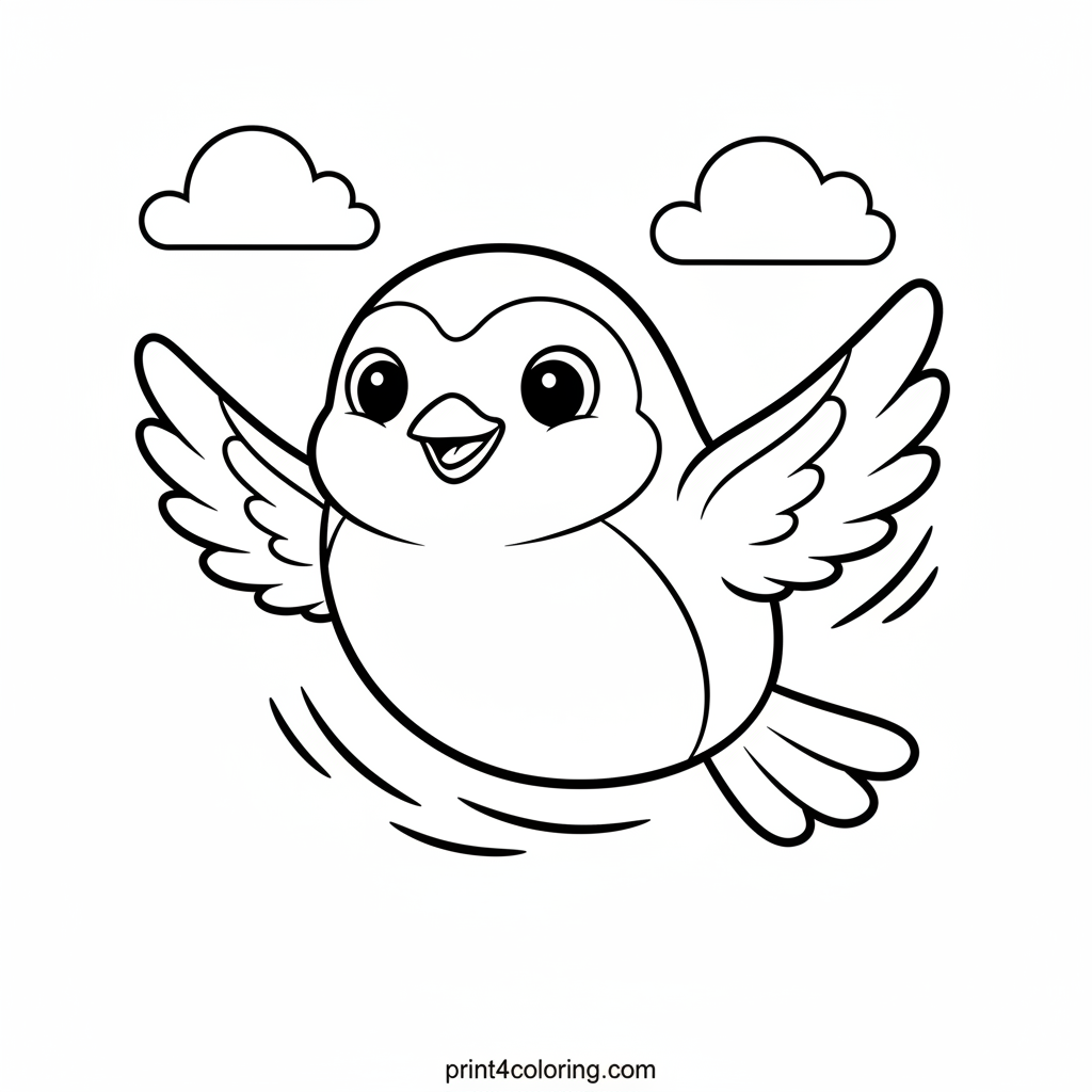 Join our cheerful robin as it takes to the skies with a big, friendly smile! Watch its wings spread wide, ready for a fun adventure high above. Imagine the fluffy clouds and bright blue sky as you bring this happy bird to life with your favorite colors. A perfect page for little artists!