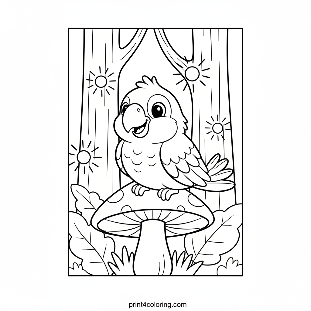 Step into a whimsical world! Color a friendly parrot with shimmering, rainbow feathers, perched gently on a glowing mushroom. Sparkling fireflies dance around in this magical forest scene, waiting for your creative touch. A delightful adventure for young artists!