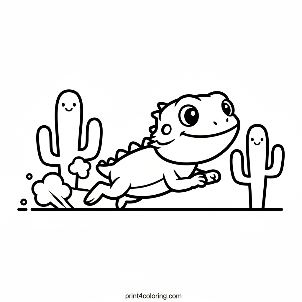 Join our adorable bearded dragon as he dashes through the warm desert! With a big smile and determined eyes, he kicks up tiny puffs of sand on his exciting journey. Simple cacti dot the background, making this a fun and easy scene to color. Get ready to add vibrant colors to his speedy adventure!