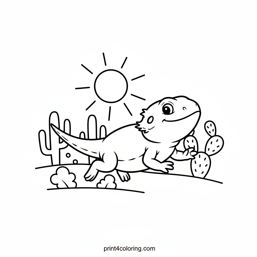 Get ready for an exciting desert adventure! This page features a happy bearded dragon, full of determination, as it dashes across the warm desert sand. Watch the tiny puffs of dust fly as it speeds past simple cactus shapes under the bright sun. A fun scene perfect for young artists to color!