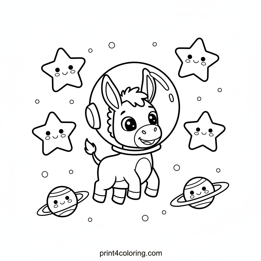 Join our adorable Stardust Donkey on an amazing journey through outer space! Wearing a tiny, friendly astronaut helmet, this sweet donkey floats gently past big, smiling stars and simple, colorful planets. Imagine the cosmic colors you'll use to bring this easy, enchanting scene to life. Get ready for a stellar coloring adventure!