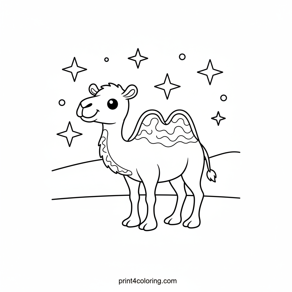Journey into a magical desert night with a friendly camel! This gentle creature has a softly glowing hump and gazes up at a sky full of sparkling stars. Use your favorite colors to bring this enchanting scene to life and imagine the quiet wonders of the desert under a blanket of starlight.