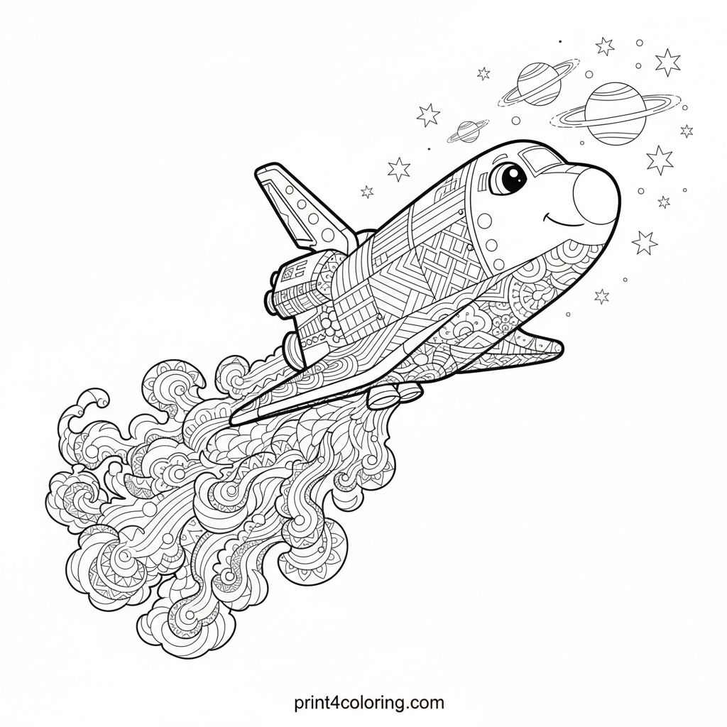 Watch as our friendly space shuttle, with its big curious eyes and soft smile, begins a gentle ascent into the shimmering night sky! Its mighty exhaust trails swirl with intricate zentangle patterns, leading your eye past distant, softly glowing planets. This adventurous scene invites you to explore the wonders of space with every color.