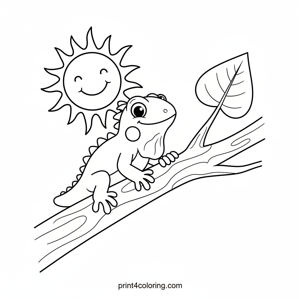 Join our happy iguana on a sunny adventure! With a big grin, this cheerful lizard carefully climbs a sturdy tree branch, reaching for a delicious, juicy leaf. The sun shines brightly, making it a perfect day for a climb. Get ready to add vibrant colors to this wonderful scene!