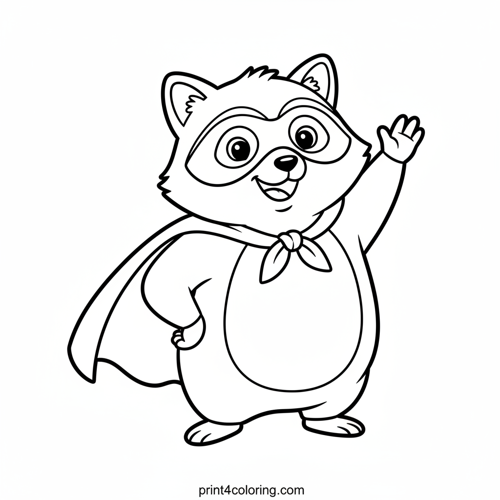 Get ready for an adventure with Super Racoon! This brave little hero is sporting a tiny cape and mask, striking a proud, heroic pose with a big grin. Imagine all the amazing deeds this masked marvel will accomplish today. Grab your crayons and bring this super-cute, caped crusader to life with vibrant colors!