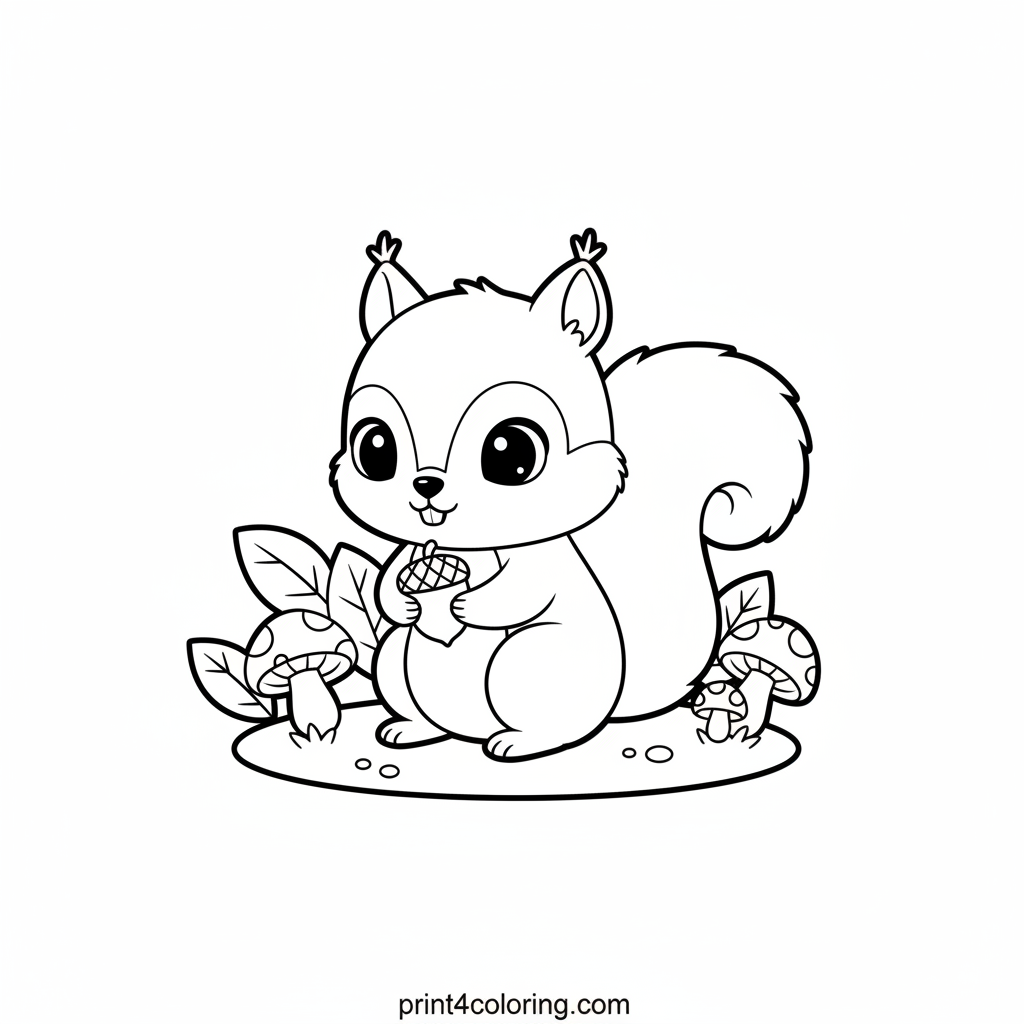 Meet an adorable baby squirrel with big, friendly eyes! This sweet little friend carefully holds a tiny acorn in its precious paws, its fluffy tail curled around its small body. Imagine all the warm colors you can use to bring this cozy woodland scene to life. A perfect page for nature lovers!
