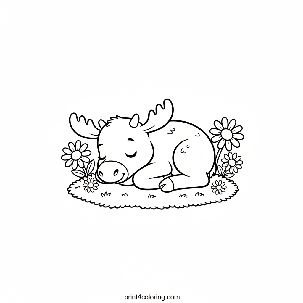Discover a precious baby moose calf enjoying a peaceful nap, nestled among soft green moss and colorful wildflowers. Its big, gentle eyes are closed as it dreams sweet dreams in the quiet wilderness. This adorable scene invites you to add your favorite colors to bring its cozy world to life.