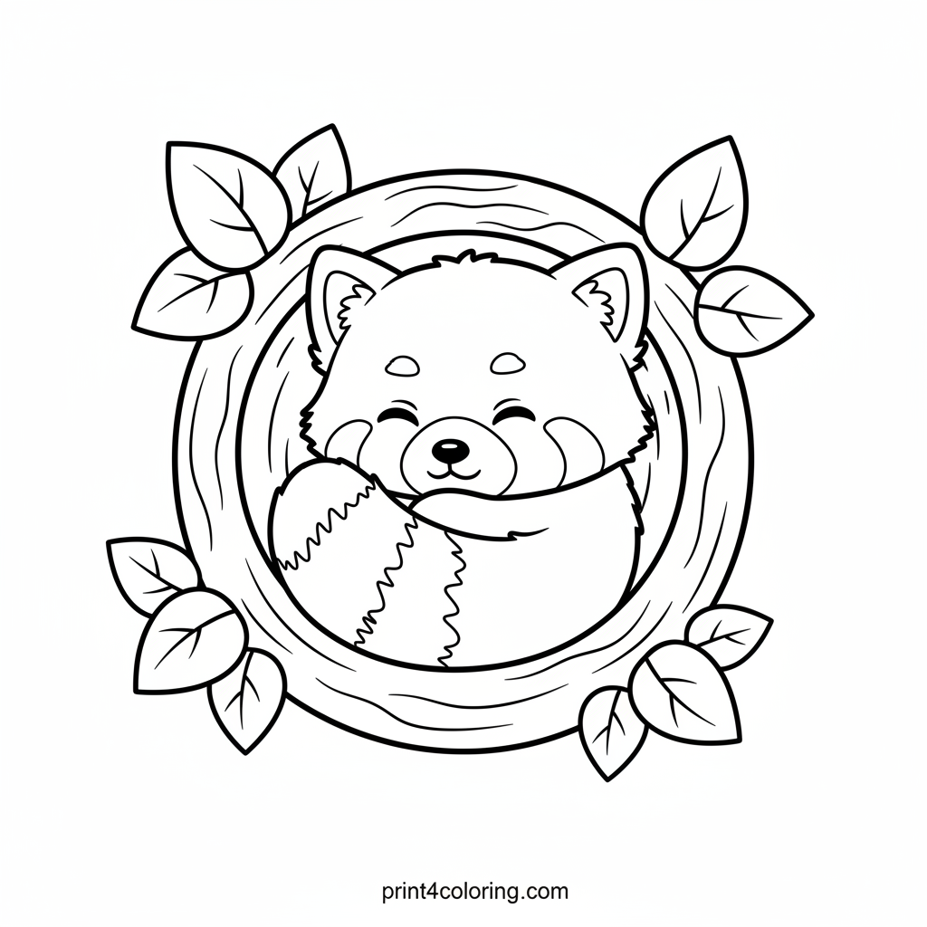Meet a precious baby red panda, fast asleep in a cozy tree hollow! This fluffy cub is curled up, dreaming sweet dreams with a gentle smile, surrounded by soft leaves. Its bushy tail is tucked in. A perfect, easy scene for young artists to color!