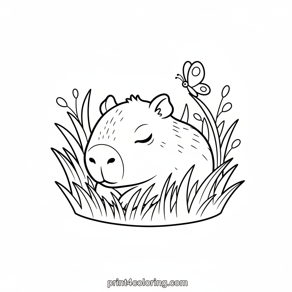 Meet a super cute baby capybara, taking its very first nap! With big, gentle eyes closed, it's snuggled deep in a cozy bed of tall green grass. A friendly butterfly has decided to join the peaceful scene, softly resting nearby. Get ready to add vibrant colors to this adorable moment of calm.