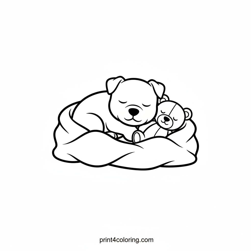 A gentle pitbull puppy is enjoying a peaceful nap, curled up snugly on a soft blanket. Its favorite teddy bear rests nearby, sharing in the quiet slumber. This heartwarming scene captures the joy of a cozy cuddle time, perfect for a relaxing coloring adventure.