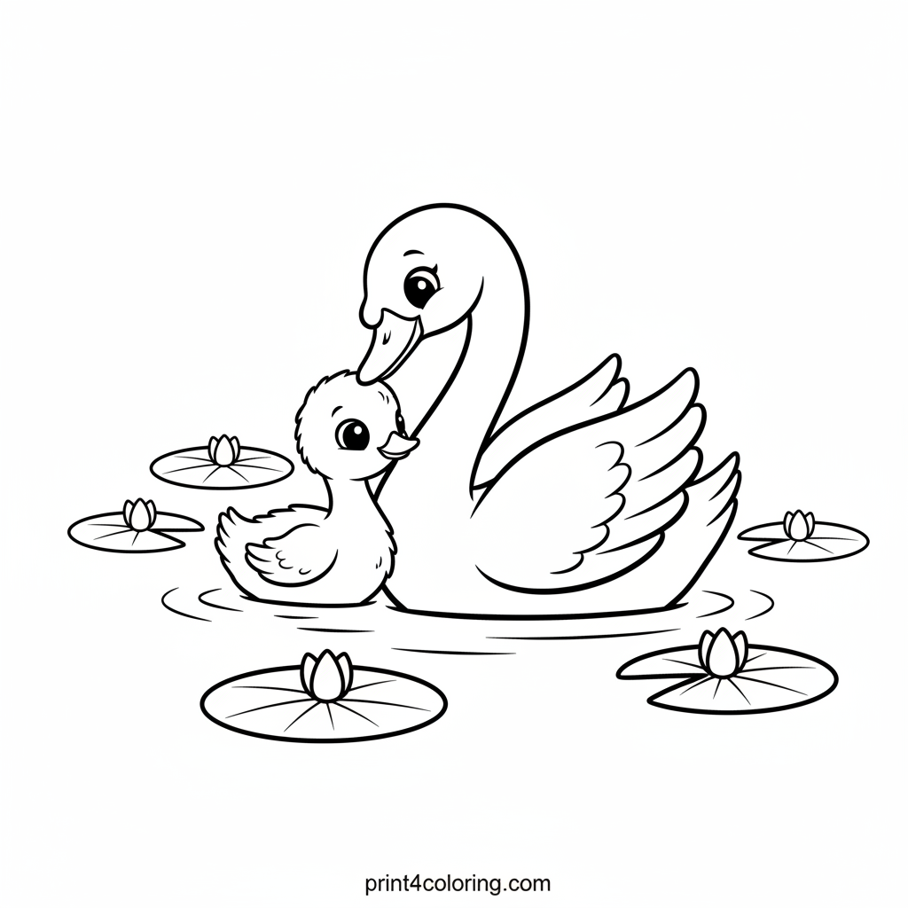 Dive into a heartwarming scene with a fluffy baby swan, called a cygnet, as it gently snuggles into its loving mother's soft wing. They float peacefully on a calm pond, surrounded by beautiful lily pads. Imagine the gentle ripples and soft feathers as you bring this sweet moment to life with your favorite colors!