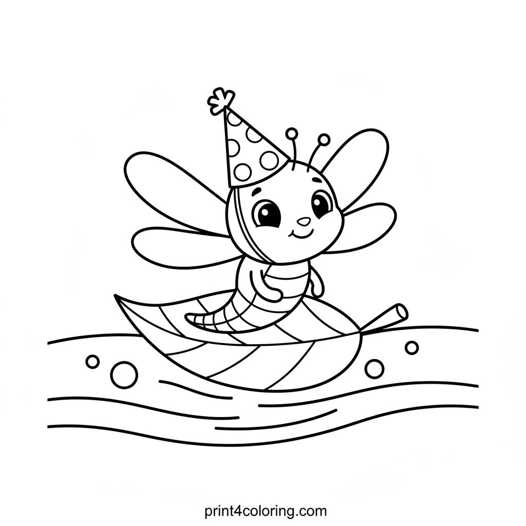 Join a cheerful dragonfly on a whimsical river ride! Wearing a tiny, comical hat, this silly friend holds tight to a large, green leaf, gently drifting down a peaceful, imaginary river. Bring this delightful journey to life with your brightest colors and imagine the fun!