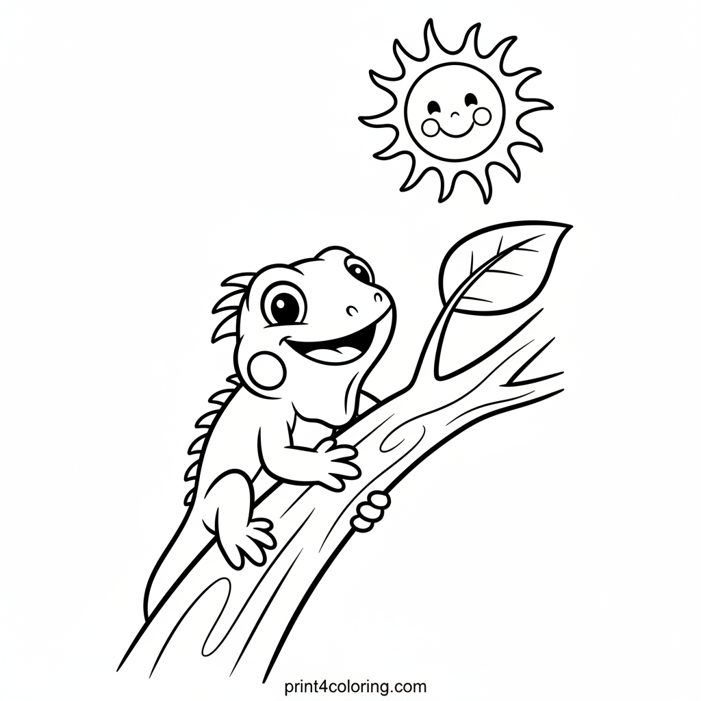 Join a cheerful iguana on an exciting sunny adventure! With a big grin, this happy lizard carefully climbs a sturdy tree branch, reaching for a delicious, juicy leaf. The sun shines brightly, making it a perfect day for a climb and a snack. Get ready to add vibrant colors!
