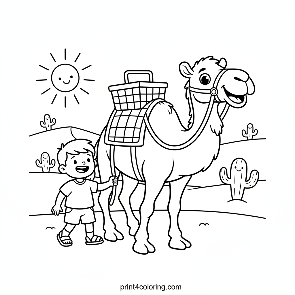 Join a happy child and their helpful camel friend on a sunny desert picnic! The friendly camel carries a checkerboard picnic basket, making sure lunch is safe. Imagine the warm sun, soft sand, and the joyful journey as you color this heartwarming scene. A perfect day for friendship and adventure!