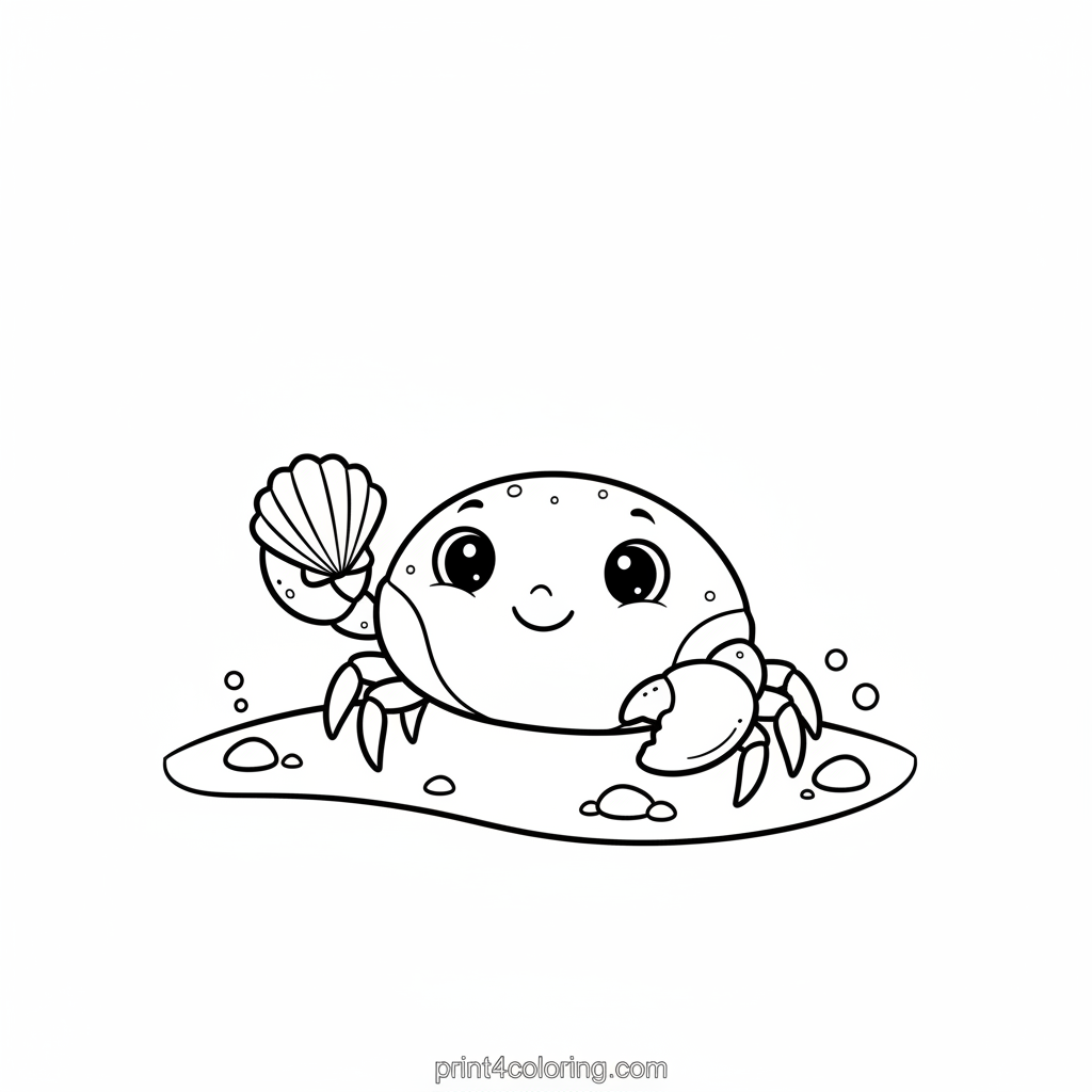 Meet a super cute baby crab with big, friendly eyes, gently cradling a beautiful seashell. Imagine this adorable little creature on a warm, sandy beach, perhaps looking for more treasures. This easy coloring page is perfect for little hands to bring to life with vibrant colors, creating a cheerful ocean scene.