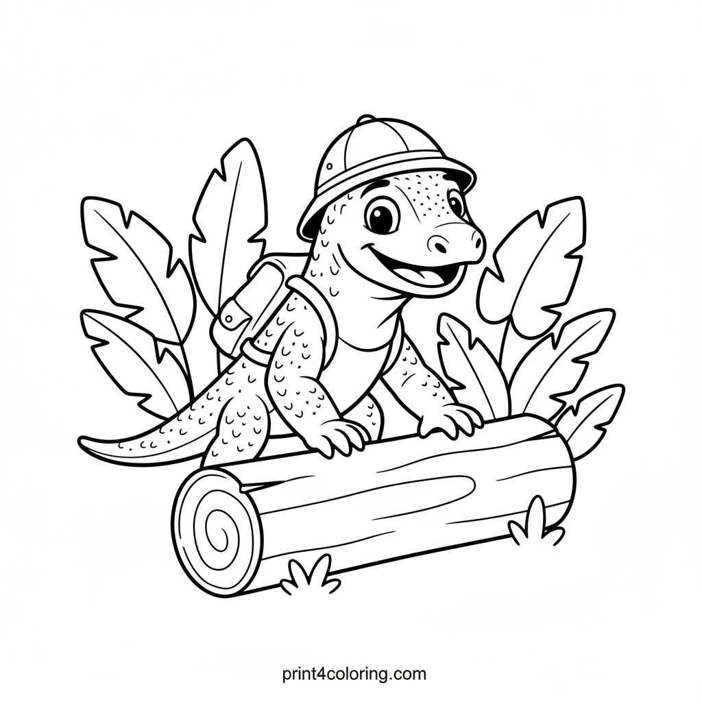 Join our happy Komodo dragon on a jungle adventure! Wearing a cute explorer's hat and a little backpack, this friendly reptile is carefully stepping over a smooth, fallen log. Imagine the exciting discoveries it will make in the lush, simple jungle. A perfect scene for young artists to bring to life with vibrant colors!