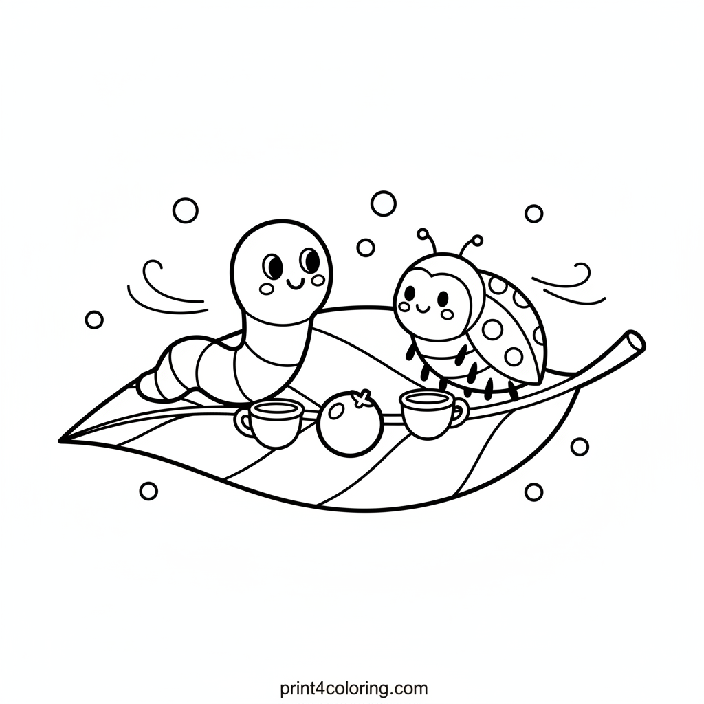 Join a happy worm and a friendly ladybug for a delightful tea party! They're sharing tiny acorn teacups and a berry treat on a big, comfortable green leaf. This charming scene invites you to add vibrant colors to their special garden get-together. Perfect for little artists!