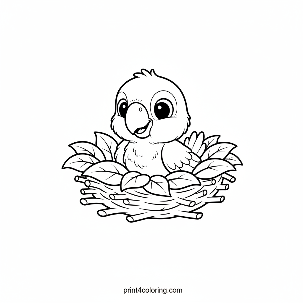 Discover a super cute, fluffy baby parrot chick, just peeking out from its cozy nest of soft leaves and twigs! With big, innocent eyes, this little bird is full of wonder and curiosity, ready to explore. Imagine all the vibrant colors you can use to bring this happy moment to life in your coloring adventure!