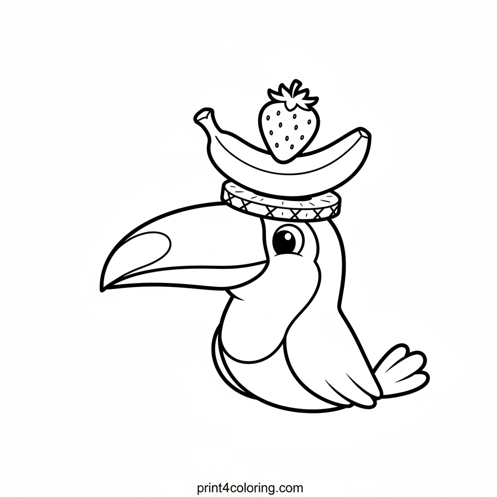 Get ready to color a super silly toucan! This happy bird is showing off its amazing, wobbly hat, piled high with delicious tropical fruits: a bright yellow banana, a juicy pineapple slice, and a sweet red strawberry. Imagine all the vibrant colors you can use to make this toucan's fruity fashion pop!