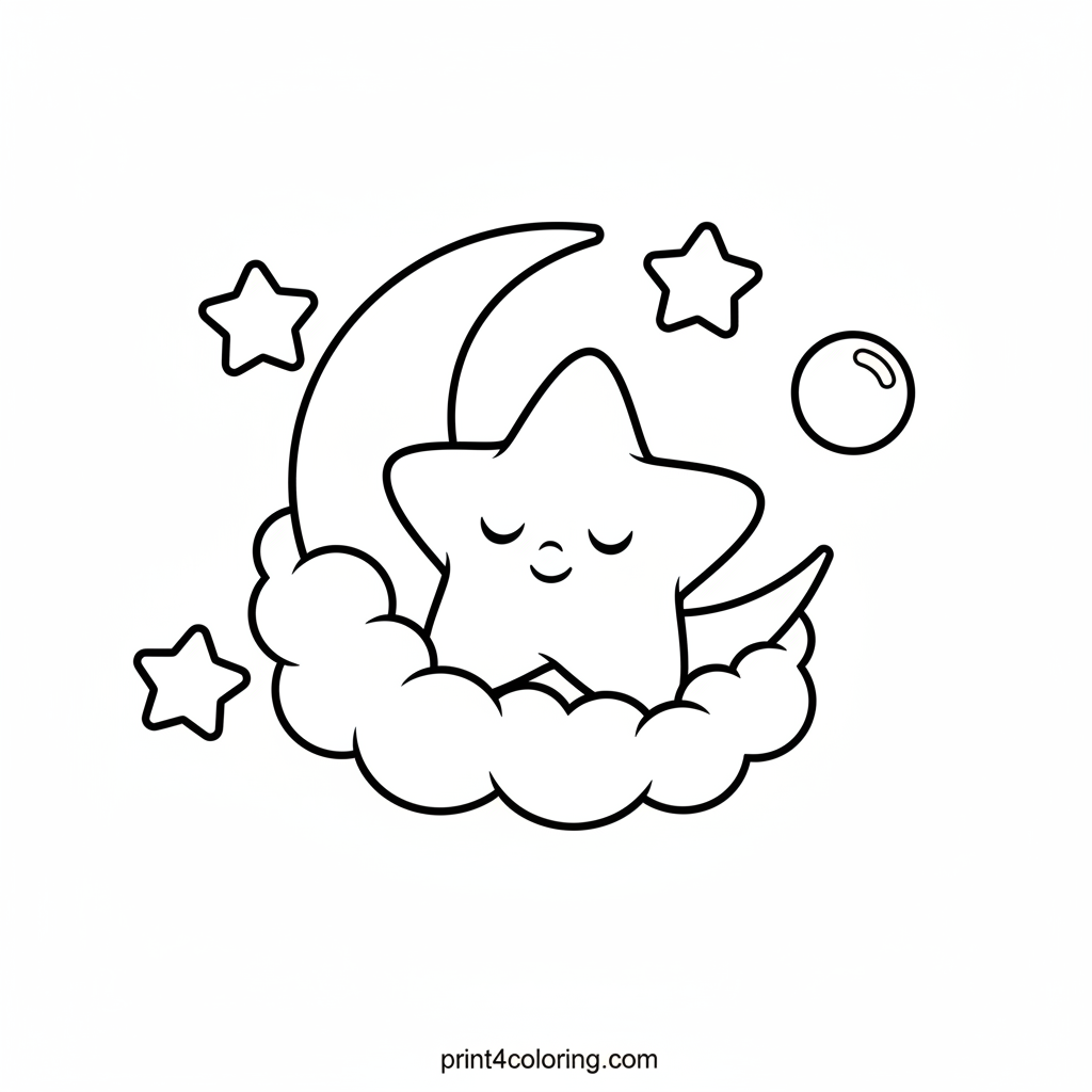 Dive into a peaceful dream with a sleepy starfish! This adorable creature gently floats on a soft crescent moon made of clouds, surrounded by tiny, sparkling star-shaped bubbles. Imagine the sweet underwater dreams it's having in this magical scene. A perfect page for a calm and imaginative coloring adventure.