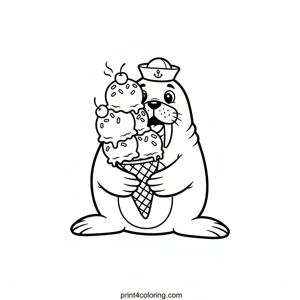 Meet Wally the Walrus, a big, smiling walrus about to enjoy a super chilly treat! He's holding a towering, delicious-looking ice cream cone with several scoops. This fun page is perfect for coloring all your favorite frosty flavors and bringing Wally's sweet adventure to life!