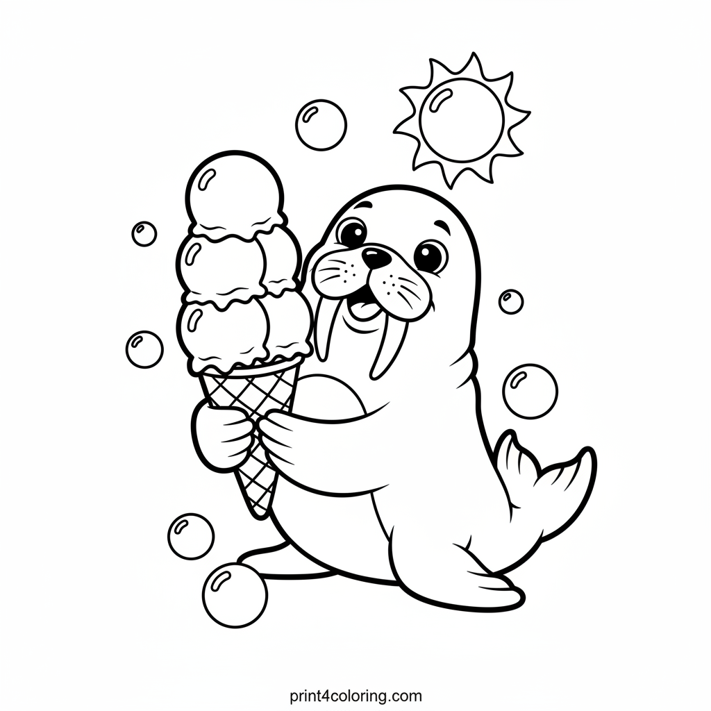 Get ready for a frosty adventure! This page features a happy, smiling walrus proudly holding a magnificent, towering ice cream cone. With several delicious scoops reaching high, our walrus friend is all set to enjoy the ultimate chilly dessert. Imagine all the yummy flavors you can add to this super cool treat!