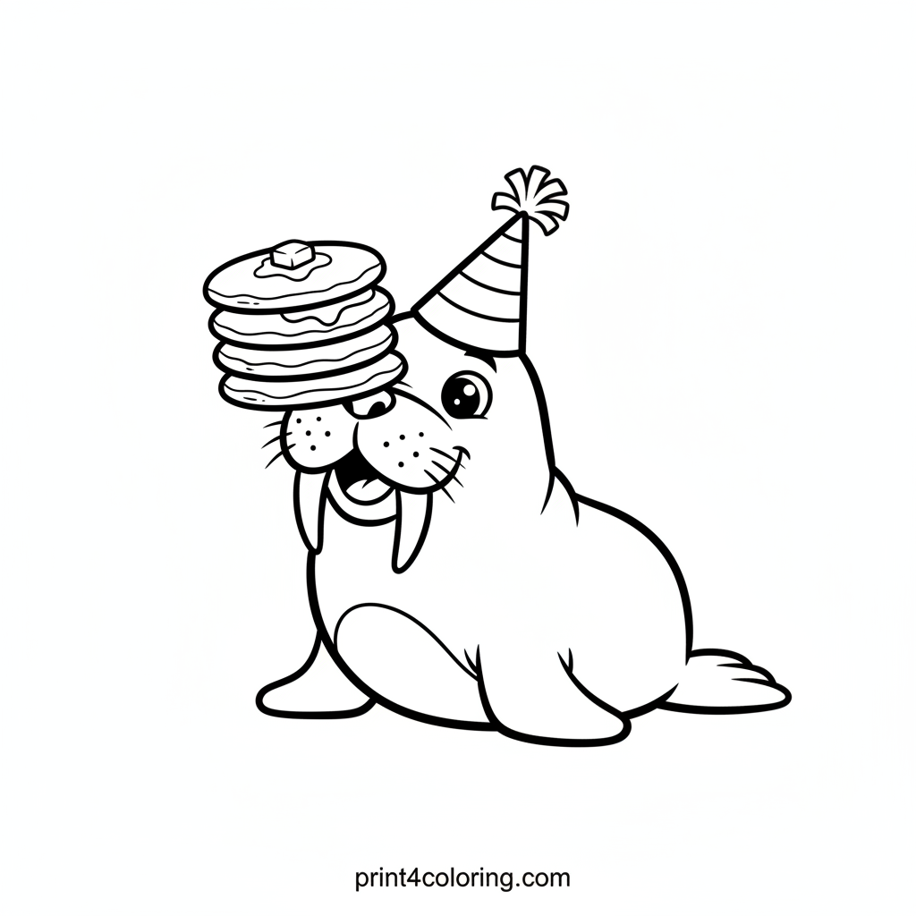 Join our jolly walrus for the most delightful party ever! This friendly fellow is sporting a tall, vibrant party hat and a mischievous grin as it expertly balances a tower of fluffy, delicious pancakes on its nose. Get ready to add your favorite colors to this wobbly, yummy scene and make it truly unforgettable!