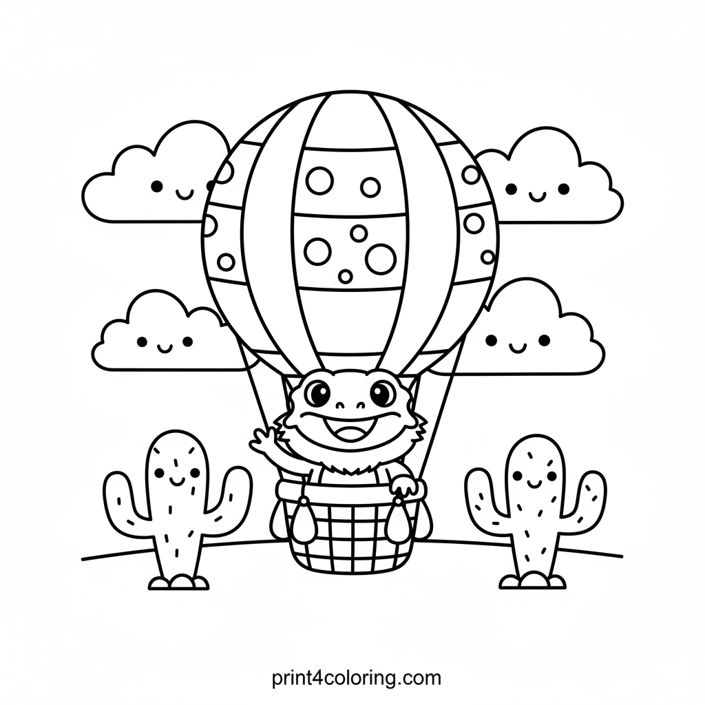 Join a cheerful bearded dragon on an amazing hot air balloon ride! Watch as he waves from his colorful basket, soaring high above a playful desert. Smiling cacti and fluffy clouds dot the whimsical landscape below. This enchanting scene is perfect for little artists to bring to life with their favorite colors, imagining a sky-high adventure!