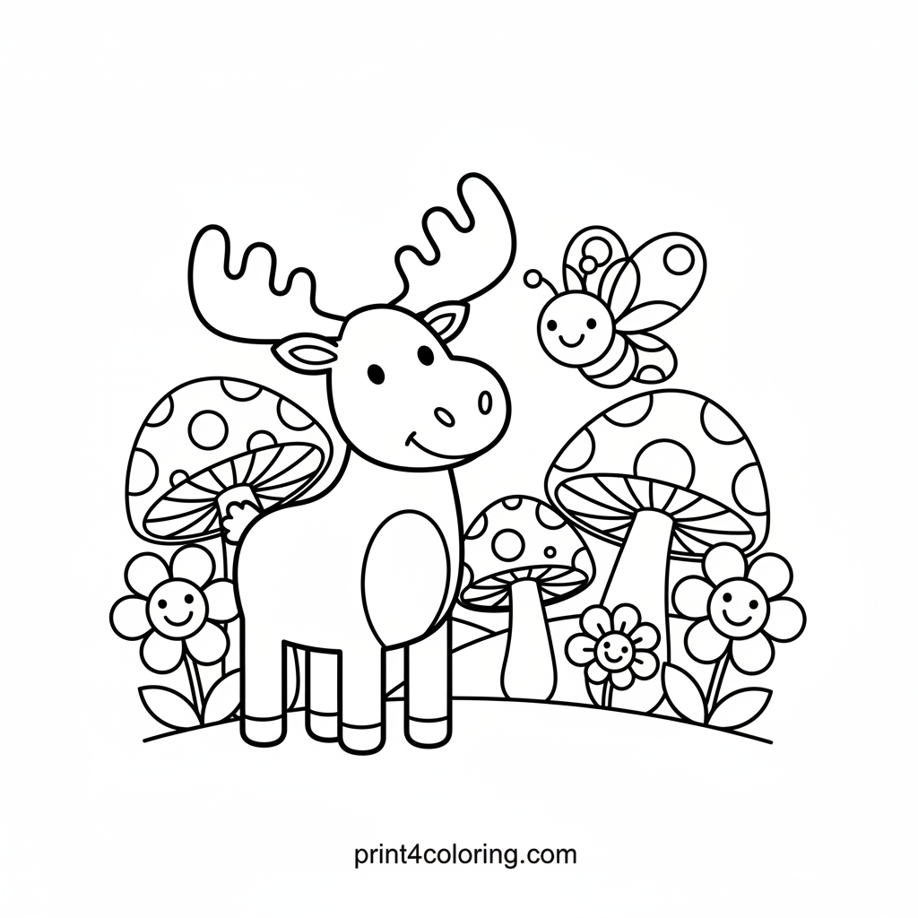 Step into a magical forest where a gentle moose with a kind smile meets a sparkling, friendly firefly. This enchanting scene features giant, simple mushrooms and happy flowers, perfect for young artists to explore. Bring this whimsical friendship to life with your favorite colors and create your own magical adventure!