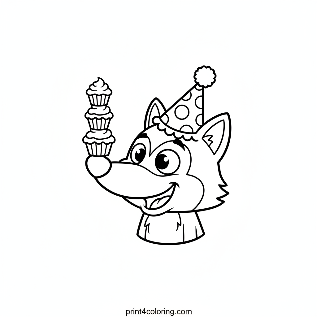 Get ready for giggles with this delightful coloring page! A cheerful wolf, sporting a hilariously oversized, polka-dotted party hat, is attempting a tricky balancing act. Watch as it carefully tries to keep a stack of tiny, imaginary cupcakes on its nose, wearing the funniest, most focused expression. A truly silly scene awaits your colors!