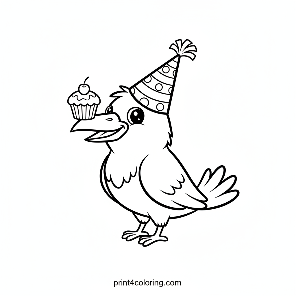 A cheerful raven is ready to party with a giant, colorful hat and a tiny cupcake! Watch as this silly bird tries to balance the sweet treat on its beak with a joyful, wobbly smile. Get ready to add lots of bright colors to this fun and festive scene!