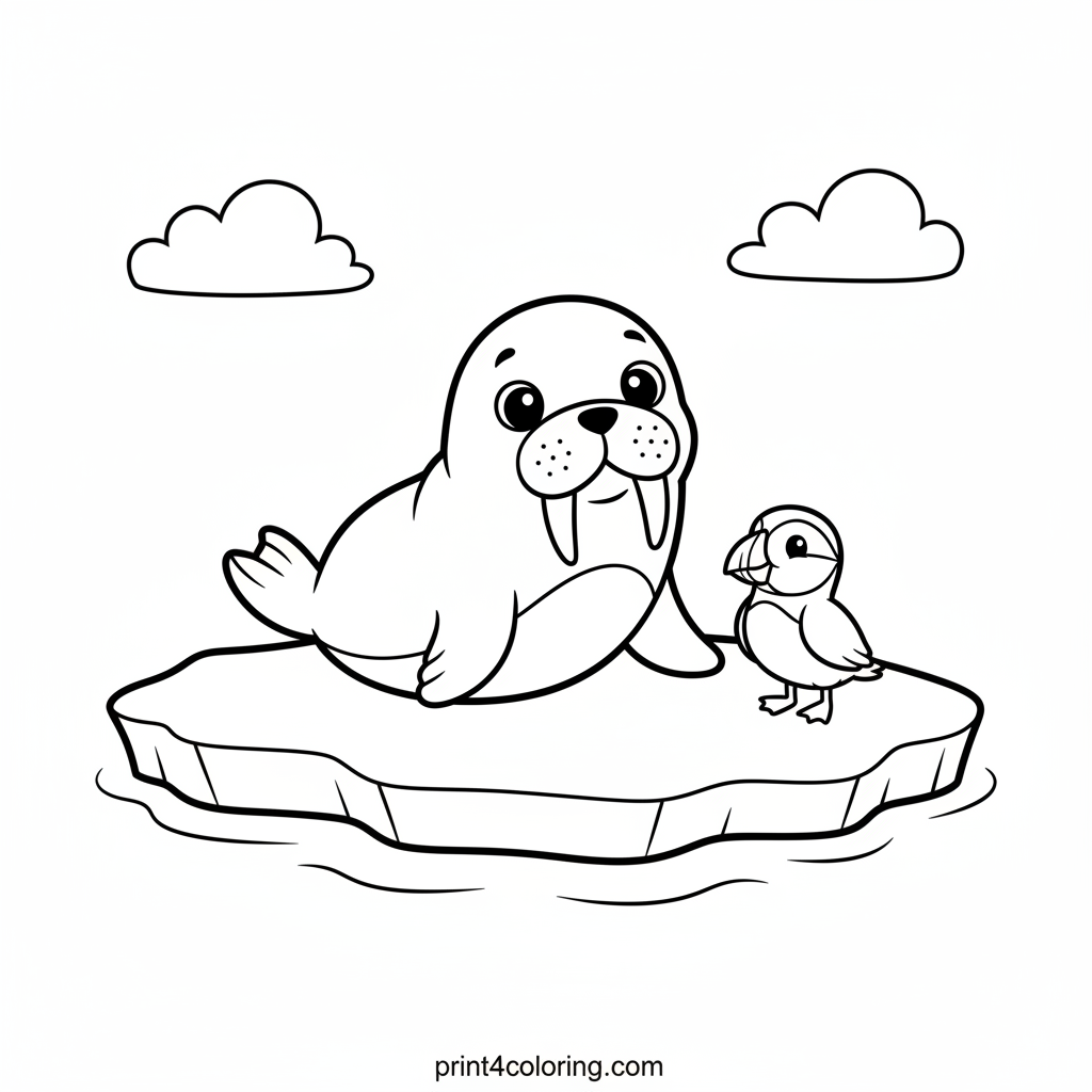 Dive into arctic fun with this adorable baby walrus! With big, friendly eyes and tiny tusks, this little guy is playfully wobbling on a frosty ice floe. A cheerful puffin friend has come to visit, adding extra joy to the scene. Grab your crayons and bring this heartwarming arctic adventure to life with vibrant colors!