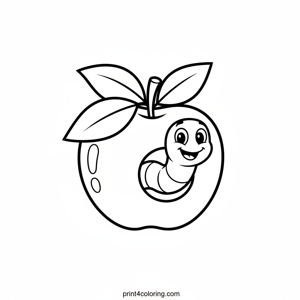 Meet Wormy, the happiest little worm in the orchard! He's found a cozy home inside a big, juicy apple, peeking out with a cheerful smile and big, friendly eyes. Surrounded by fresh green leaves, Wormy invites you to add vibrant colors to his delightful apple abode. A sweet coloring adventure!