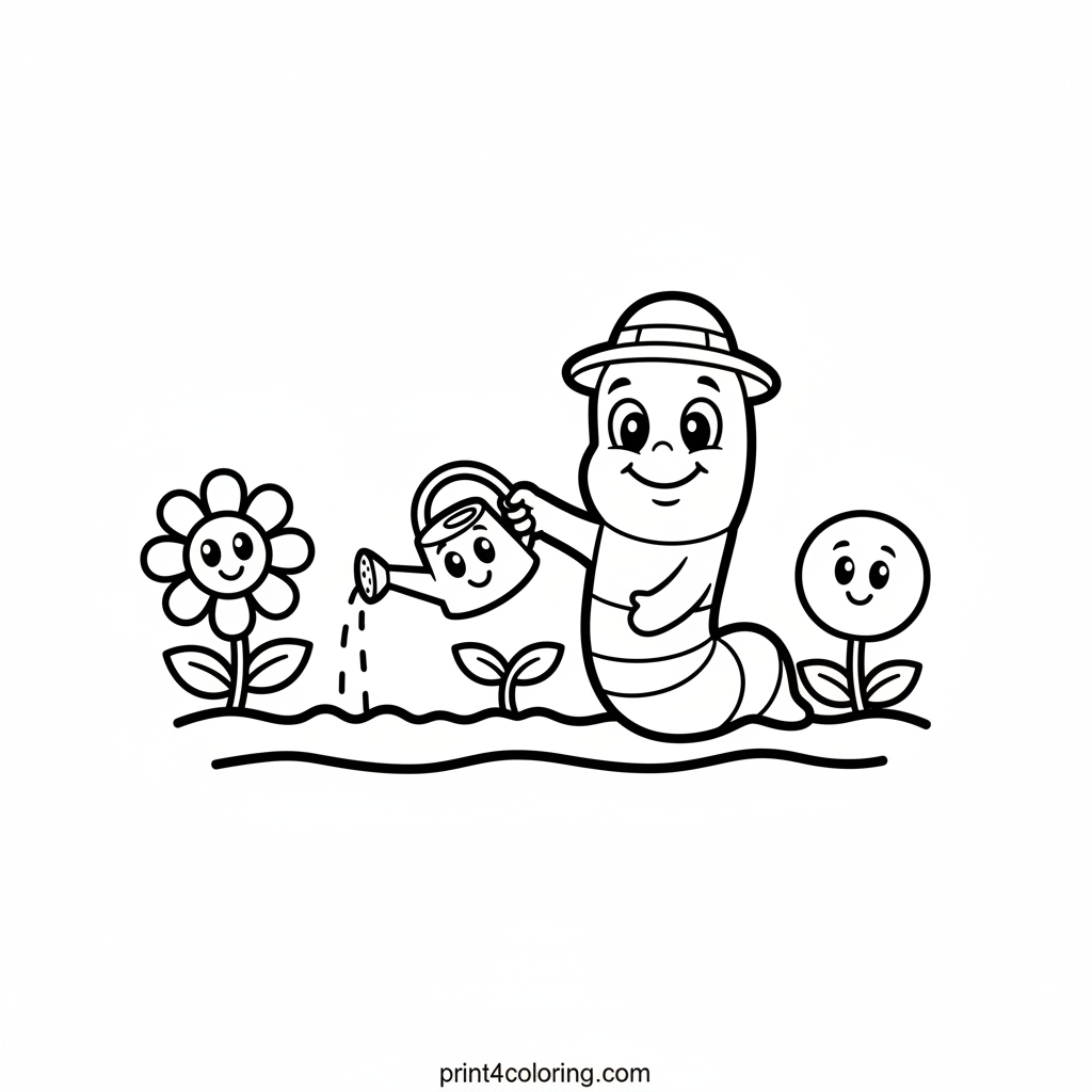 Join Wormy the kind gardener as he carefully helps a tiny plant sprout from the ground! Watch him use his special leaf watering can to give it a drink, surrounded by other cheerful little plants. This easy coloring page invites you to bring a vibrant garden scene to life with your favorite colors.