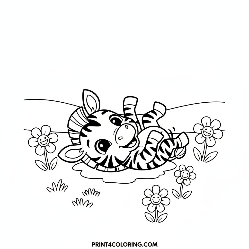 Meet Zola, an adorable baby zebra foal with big, curious eyes! She's gleefully rolling around in a cheerful field, surrounded by happy, simple flowers. This easy coloring page captures Zola's playful spirit and the joy of nature, ready for you to add vibrant colors to her stripes and the blooming meadow.
