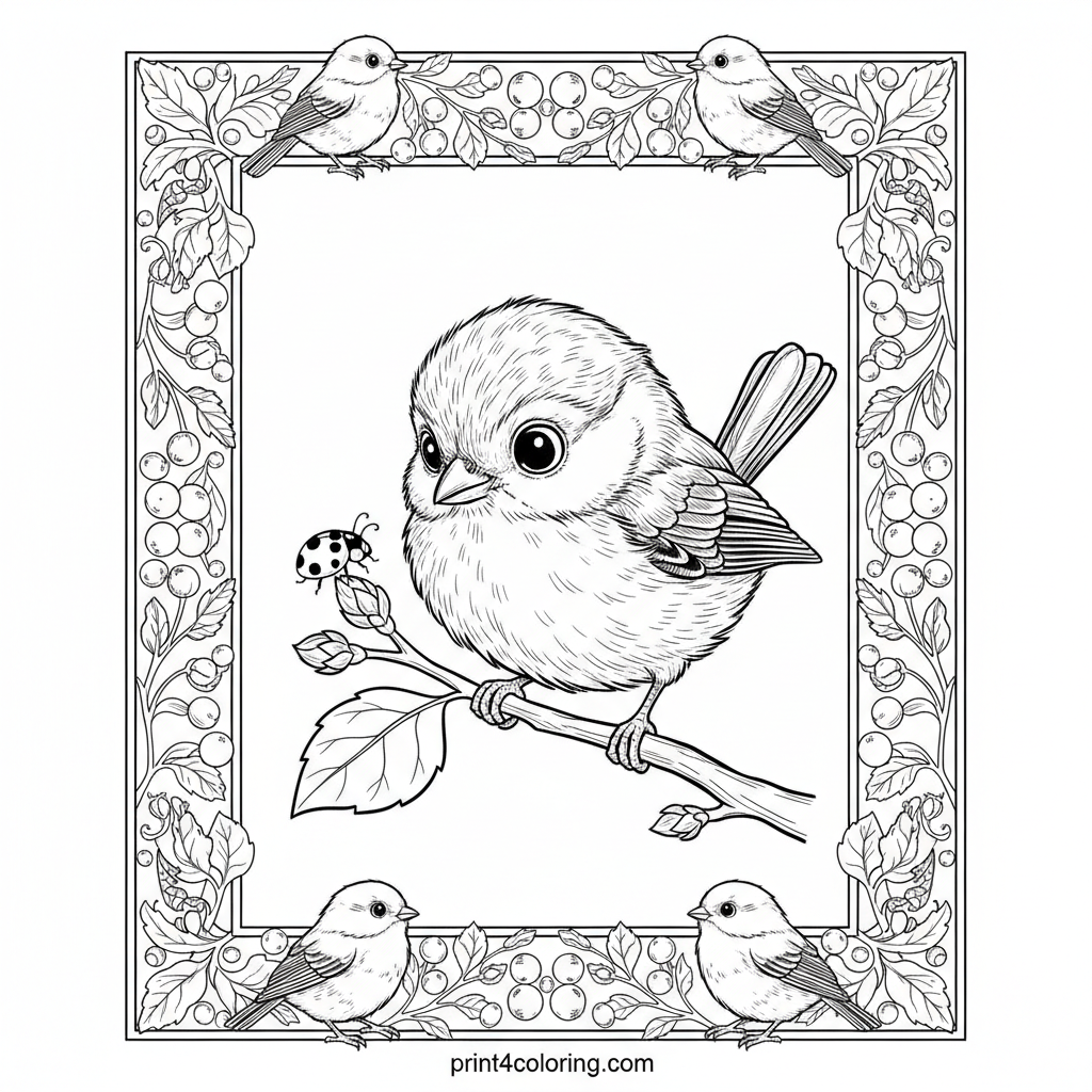 Meet a fluffy, young chickadee with big, curious eyes, delicately perched on a budding branch. Watch as it quietly observes a tiny ladybug on a leaf. This expert-level page features realistic feather details and beautiful botanical elements, perfect for bringing a spring scene to life with your favorite colors.
