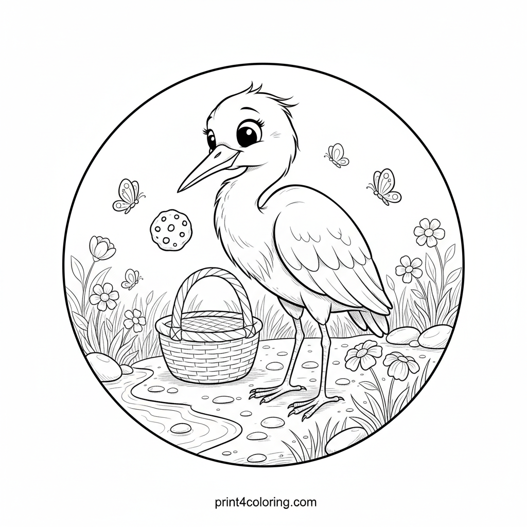 Imagine a charming riverbank scene where a graceful heron stands with a quizzical look beside a child's forgotten picnic basket. Delicate butterflies dance among wildflowers, while detailed grass and pebbles invite careful coloring. Can you capture the heron's gentle curiosity about a dropped cookie?