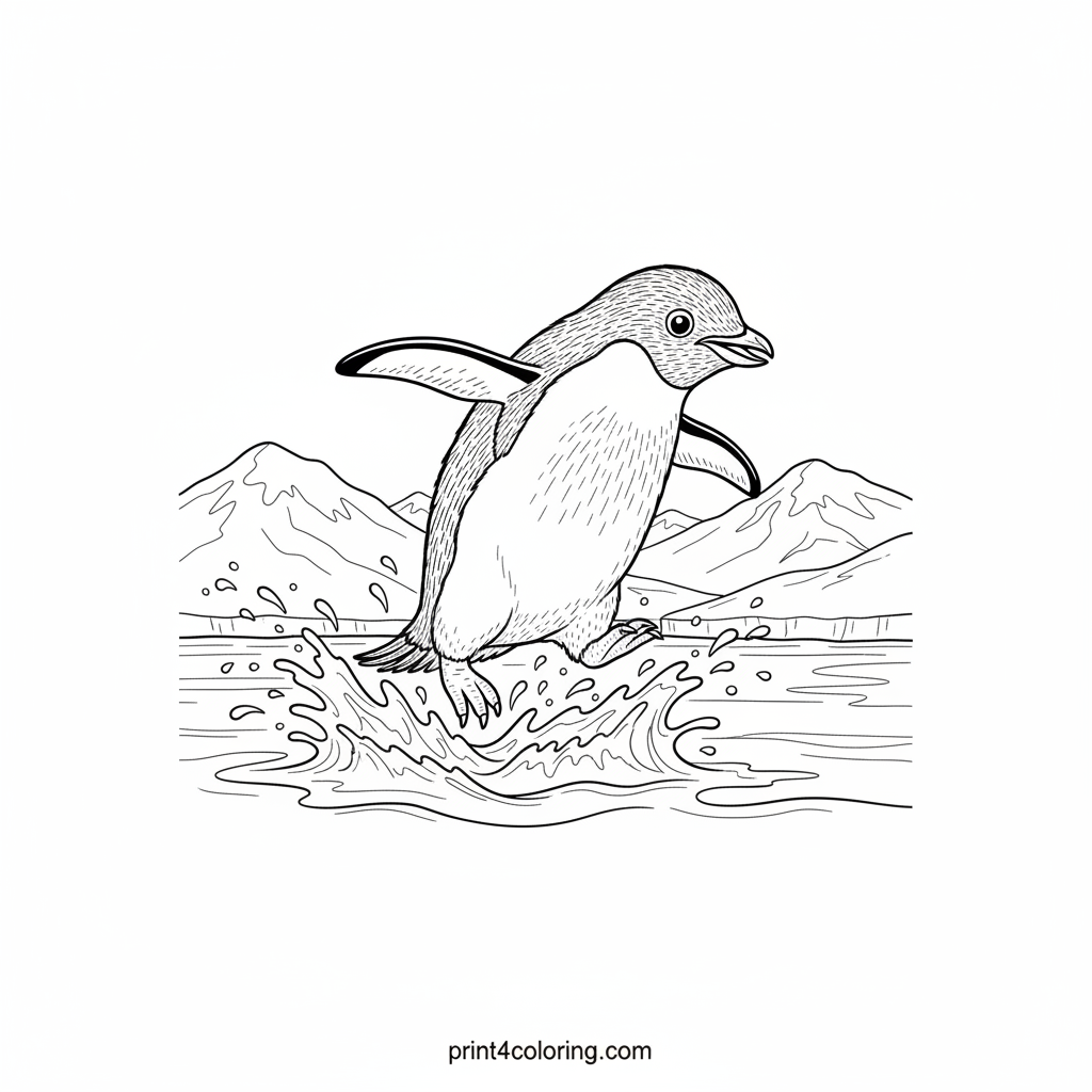 Dive into the chilly Arctic with this incredible scene! An Adélie penguin bursts from the sparkling ocean, surrounded by glistening water droplets. Majestic icy mountains and a distant coastline form the backdrop. Bring this energetic leap to life with your vibrant colors!