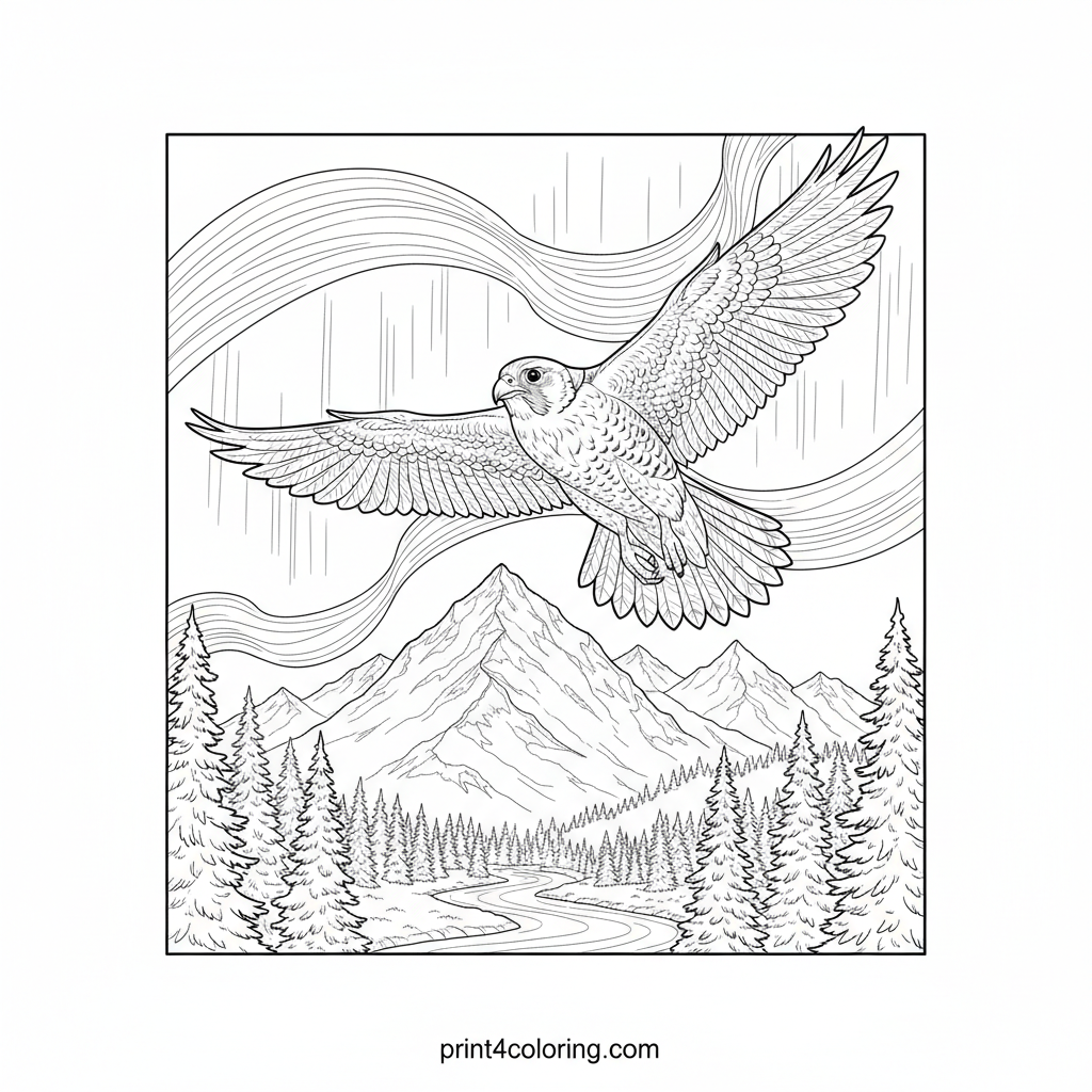 #falcon#aurora borealis#night sky#mountains#fantasy#birds#nature#celestial#coloring-page#printable