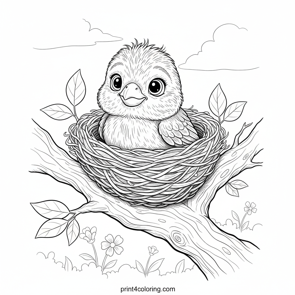 Discover a heartwarming scene featuring a tiny, fluffy canary hatchling. With big, curious eyes, this sweet baby bird peeks from its intricately woven nest, experiencing the world for the very first time. Enjoy coloring the soft downy feathers and the detailed textures of its cozy home in this delightful nature moment.