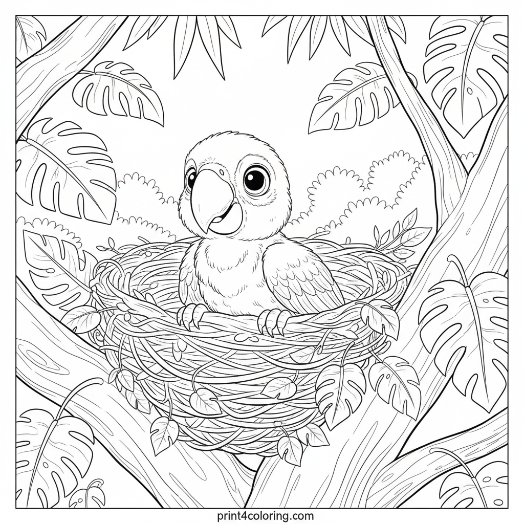 Discover a precious baby macaw, its large, curious eyes peeking from a cozy, leafy nest high in the vibrant rainforest canopy. This intricate scene invites you to color its delicate feathers, tiny claws, and the rich textures of its home. A delightful challenge for expert colorists!