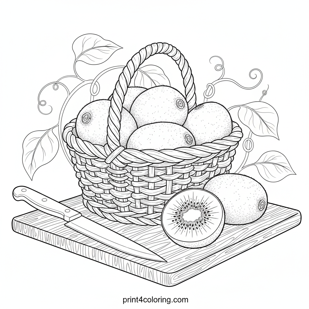 Step into a vibrant kiwi orchard with this detailed coloring page! Discover fuzzy whole kiwis nestled in a woven basket, alongside a perfectly sliced fruit on a wooden board, showing its emerald green flesh and tiny seeds. A harvesting tool waits nearby. Imagine the sweet taste as you bring this abundant harvest scene to life with your colors!