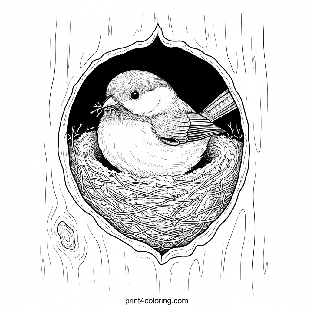 Step into the peaceful forest and discover a diligent chickadee meticulously crafting its snug home! This intricate scene shows the tiny bird arranging soft moss and twigs within a hollow tree trunk, preparing for its future family. A delightful challenge for expert colorists to bring this woodland wonder to life.